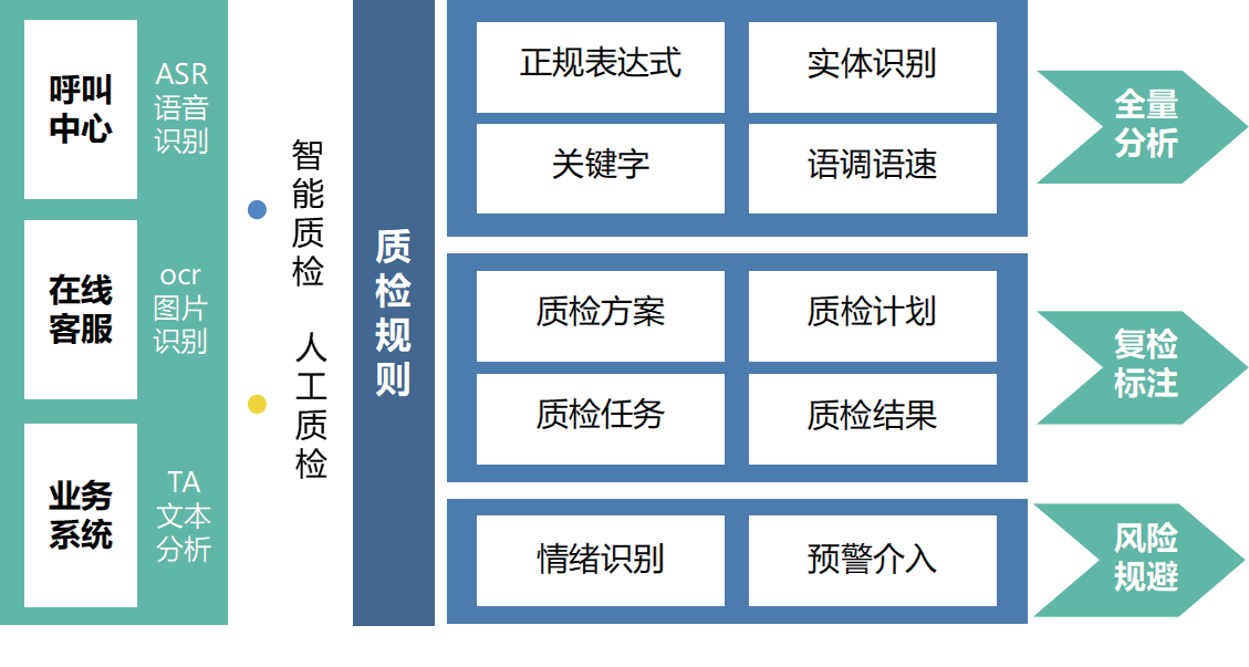 Á¬ÏµÕýÔò±í´ï¡¢ÎÄÌìÖ°Îö¡¢ÓïÒåÃ÷È·µÈÊÖÒÕ¹¹½¨ÐÐÒµÊ×´´µÄ¶àάÈںϵÄÖÊ¼ì¹æÔò£¬£¬£¬Ö§³ÖÒªº¦´Ê¼ì²â¡¢ÇéÐ÷¼ì²â¡¢ÓïËÙÒôÁ¿¼ì²â¡¢·þÎñÇÀ²å»°¼ì²â¡¢¿Í·þÏìÓ¦µÈ¹æÔò¡£¡£